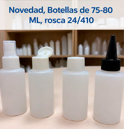Disponemos de diversos tipos de botellas (cilíndricas, ovaladas, etc.) y diferentes capacidades (desde 50 a 1000 cc). Además de fabricación de envases a medida.